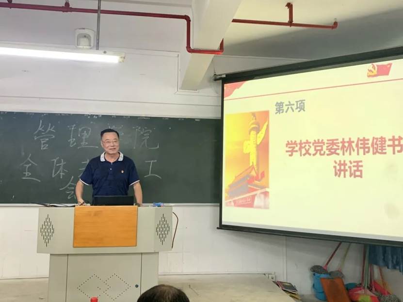 會議第六項,學(xué)校黨委林偉健書記總結(jié)發(fā)言,他肯定了管理學(xué)院全體教職工對學(xué)院黨建工作的付出和努力,展現(xiàn)了我們的新時代官員精神,并對管理學(xué)院教職工提出以下幾點(diǎn)要求: