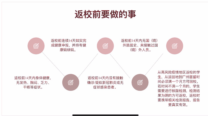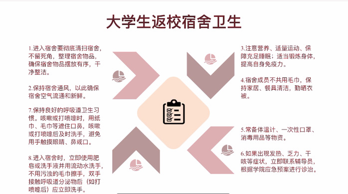 此外,還為同學(xué)們講述了返校必備,并列了必備清單。需要攜帶口罩、免洗酒精消毒液、殺菌洗手液、飯盒、床上用品、個(gè)人用品等。