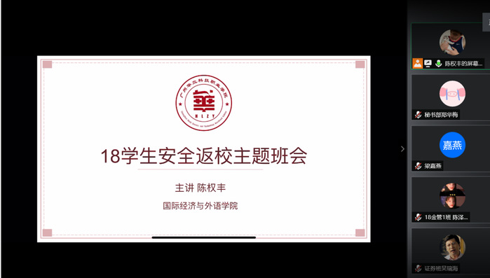 為了更進(jìn)一步讓學(xué)院學(xué)生樹立安全意識(shí),指導(dǎo)學(xué)生做好開學(xué)前準(zhǔn)備工作,讓學(xué)生安全順利地返校。2020年6月11日中午12點(diǎn),國際經(jīng)濟(jì)與外語學(xué)院召開線上“18級(jí)學(xué)生安全返?!敝黝}班會(huì)。本次會(huì)議主講人為國濟(jì)經(jīng)濟(jì)與外語學(xué)院陳權(quán)豐書記主持。