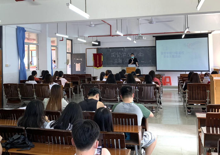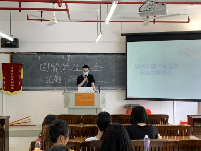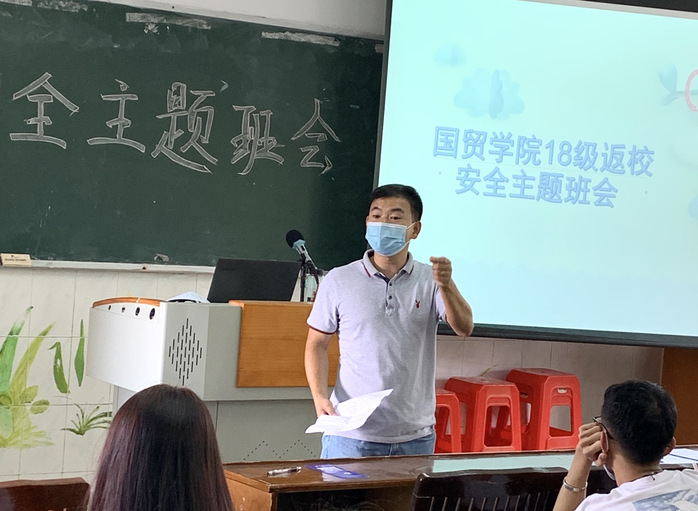 2020年7月6日在西一各班教室召開“18級返校安全主與安全離校班會”、“18級防詐騙主題班會”與“18級校外實習見面會”。本次會議由國貿(mào)學院學管主任劉偉鑫老師、18級輔導員陳權豐老師、18級各班校外指導老師主講,18級全體學生出席。
