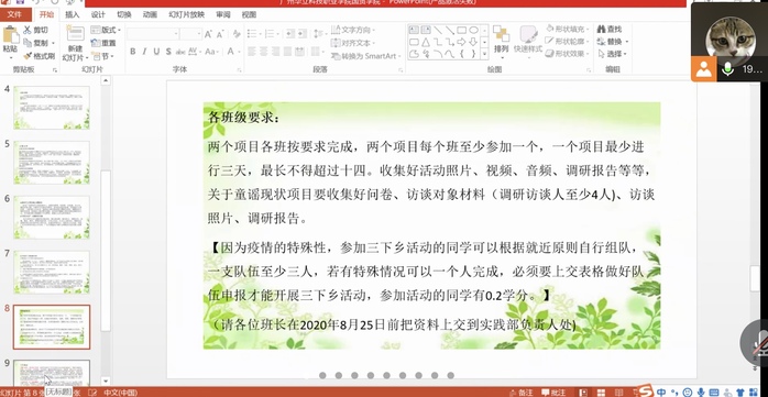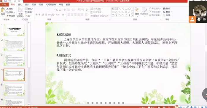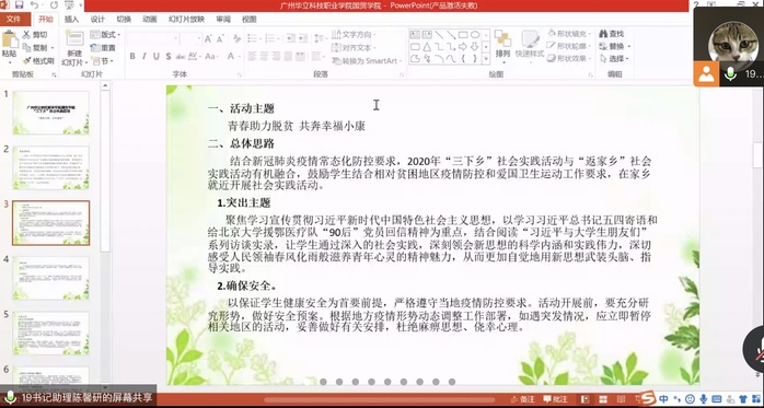 首先,陳馨妍同學(xué)給大家講述活動(dòng)的主題,是以“青春助力脫貧,共奔幸福小康”為主題的三下鄉(xiāng)社會(huì)實(shí)踐活動(dòng)。講解活動(dòng)的總體思路,要結(jié)合新冠肺炎疫情常態(tài)化防控要求,鼓勵(lì)學(xué)生結(jié)合相對(duì)貧困地區(qū)疫情和愛國(guó)衛(wèi)生運(yùn)動(dòng)工作要求,在家鄉(xiāng)就近開展社會(huì)實(shí)踐活動(dòng),活動(dòng)要求突出主題,確保安全,就近就便,創(chuàng)新行式。