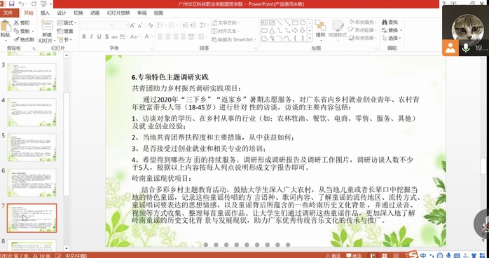 接著,談到專項(xiàng)特色主題調(diào)研實(shí)踐。分別是共青團(tuán)助力鄉(xiāng)村振興調(diào)研實(shí)踐項(xiàng)目和嶺南童謠現(xiàn)狀項(xiàng)目;共青團(tuán)助力鄉(xiāng)村振興調(diào)研實(shí)踐項(xiàng)目通過(guò)2020年“三下鄉(xiāng)”“返家鄉(xiāng)”暑假志愿服務(wù)。對(duì)廣東省內(nèi)鄉(xiāng)村就業(yè)創(chuàng)業(yè)青年、農(nóng)村青年致富帶頭人等進(jìn)行針對(duì)性的訪談。嶺南童謠現(xiàn)狀項(xiàng)目是結(jié)合多彩鄉(xiāng)村為主題的教育活動(dòng),鼓勵(lì)大學(xué)生深入廣大農(nóng)村,從當(dāng)?shù)貎和蛘唛L(zhǎng)輩口中挖掘當(dāng)?shù)氐奶厣{,讓大學(xué)生通過(guò)調(diào)研童謠作品,更加深入地了解嶺南童謠的歷史文化背景與發(fā)展現(xiàn)狀。