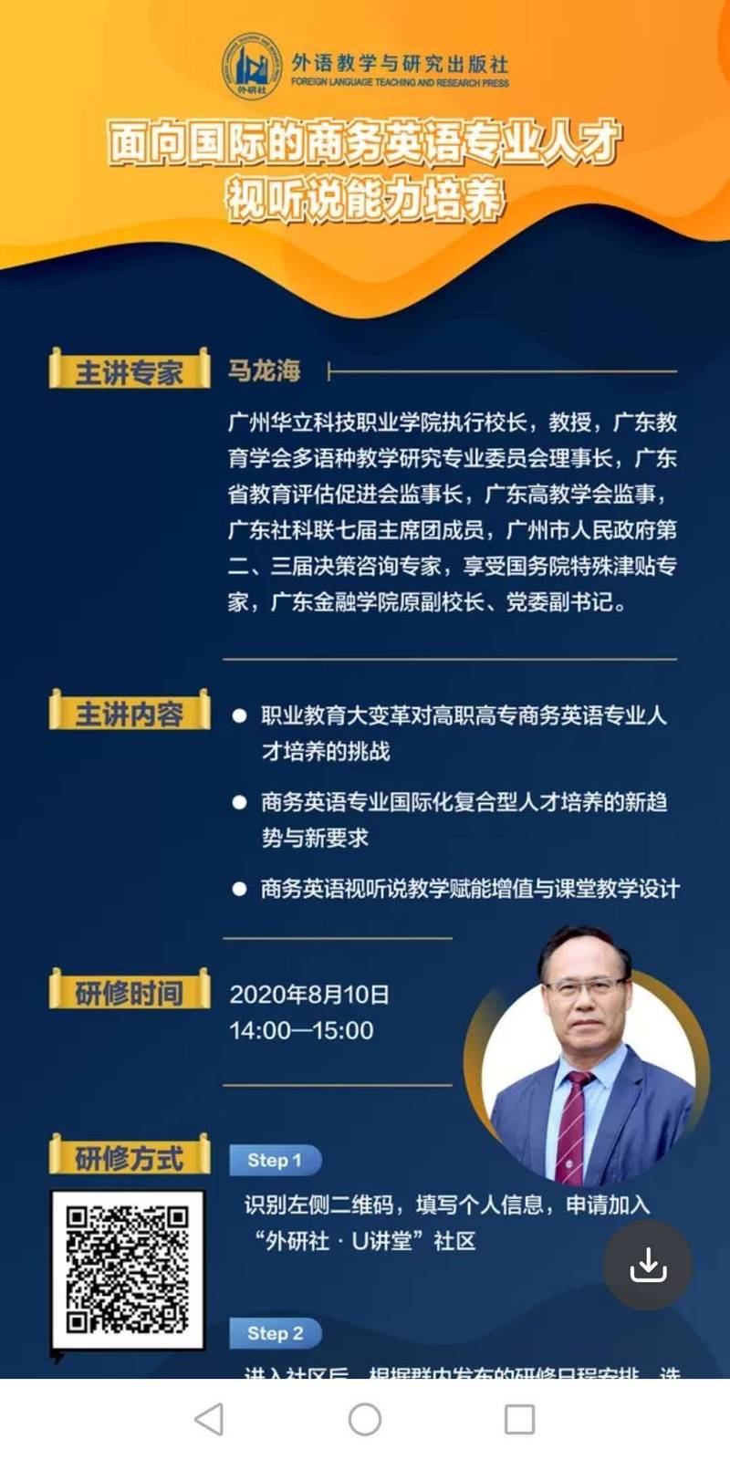 8月10日下午2:00,“外研社·U講堂社區(qū)”直播講座在釘釘群如期舉行。廣州華立科技職業(yè)學(xué)院馬龍海教授為大家?guī)?lái)了《面向國(guó)際的商務(wù)英語(yǔ)人才視聽(tīng)說(shuō)能力培養(yǎng)》主題講座。