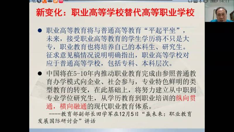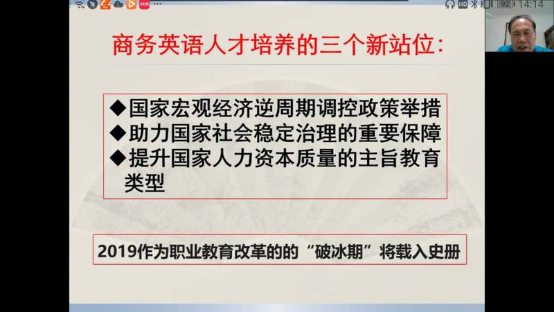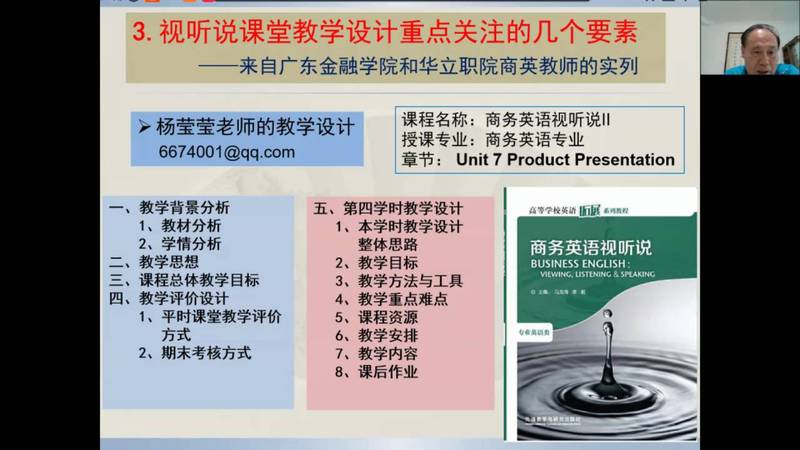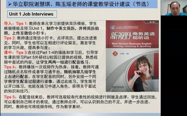 直播講座中,馬龍海教授就職業(yè)教育大變革對(duì)高職高專商務(wù)英語(yǔ)專業(yè)人才培養(yǎng)的挑戰(zhàn)進(jìn)行了詳細(xì)解讀,幫助教師深化了對(duì)職業(yè)教育大變革帶來(lái)的“三個(gè)新站位”,四個(gè)“新定位”的認(rèn)識(shí),并指出內(nèi)涵發(fā)展是適應(yīng)職業(yè)教育改革的必然選擇。分析了商務(wù)英語(yǔ)專業(yè)國(guó)際化復(fù)合型人才培養(yǎng)的新趨勢(shì)與新要求,要培養(yǎng)適應(yīng)現(xiàn)代化的復(fù)合型人才應(yīng)聚焦和回歸到課程改革,因?yàn)檎n程是學(xué)生消費(fèi)高等教育資源的基本單位,是高等學(xué)校一切辦學(xué)行為和人財(cái)物資資源配置的最終載體,是學(xué)校人才培養(yǎng)質(zhì)量?jī)?nèi)涵建設(shè)水平的標(biāo)志和落腳點(diǎn),決定著學(xué)校品牌影響力與核心競(jìng)爭(zhēng)力的形成。并從理念更新取向、體系構(gòu)建取向、教學(xué)能力取向、方法載體取向四個(gè)維度,就如何進(jìn)行課程建設(shè)提出建議。馬龍海教授強(qiáng)調(diào),在職業(yè)教育課程體系構(gòu)建的關(guān)鍵點(diǎn)是工作過(guò)程導(dǎo)向;教師要作學(xué)生成長(zhǎng)的引路人,要注重交叉跨界能力;產(chǎn)教融合是職業(yè)教育的精髓和改革方向,在每一點(diǎn)的講解中,馬龍海教授都結(jié)合了《新視野商務(wù)英語(yǔ)綜合教程(智慧版)》或《新視野商務(wù)英語(yǔ)視聽(tīng)說(shuō)(第三版)》的教材編寫(xiě)理念,以之為例,說(shuō)明如何落實(shí)課程改革,如何培養(yǎng)商務(wù)復(fù)合型人才,如何結(jié)合現(xiàn)代化信息技術(shù)手段。商務(wù)英語(yǔ)視聽(tīng)說(shuō)教學(xué)應(yīng)進(jìn)一步明確培養(yǎng)目標(biāo),創(chuàng)新商務(wù)英語(yǔ)人才培養(yǎng);對(duì)標(biāo)教學(xué)效能標(biāo)準(zhǔn);打造適應(yīng)“新商科”發(fā)展需要的教師課程團(tuán)隊(duì);采用與時(shí)俱進(jìn)的教學(xué)方法和載體。并著重對(duì)商務(wù)英語(yǔ)視聽(tīng)說(shuō)課堂教學(xué)提出建議,為廣大教師講解了“肯普模式”的教學(xué)設(shè)計(jì)的框架結(jié)構(gòu),并指出視聽(tīng)說(shuō)課堂教學(xué)設(shè)計(jì)重點(diǎn)關(guān)注的要素,并分享和點(diǎn)評(píng)了廣東金融學(xué)院楊瑩瑩老師和華立科技職業(yè)學(xué)院謝慧琪、陳玉瑤老師的教學(xué)設(shè)計(jì)建議。當(dāng)前職業(yè)高等教育已經(jīng)發(fā)展到了國(guó)家戰(zhàn)略層面,職業(yè)教育從民生領(lǐng)域“置頂”于宏觀政策領(lǐng)域,就業(yè)導(dǎo)向的職業(yè)教育必須將自身的功能與國(guó)家和歷史的重任緊密相連。