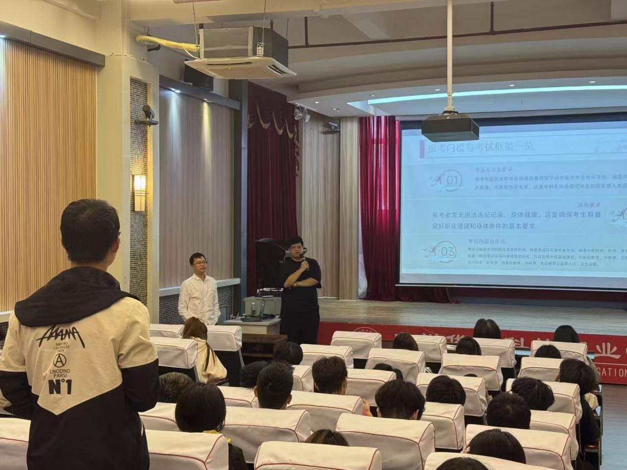 隨后,吳秉晉老師以“執(zhí)醫(yī)路,少年行”為主題開展專題分享。吳老師結(jié)合自身經(jīng)歷,從中醫(yī)藥行業(yè)就業(yè)現(xiàn)狀、職業(yè)發(fā)展方向、專業(yè)學(xué)習(xí)、升學(xué)以及考證等多個(gè)維度為同學(xué)們進(jìn)行了系統(tǒng)講解,還針對(duì)同學(xué)們普遍關(guān)心的職業(yè)選擇困惑、能力提升重點(diǎn)等問題給出了具體建議。