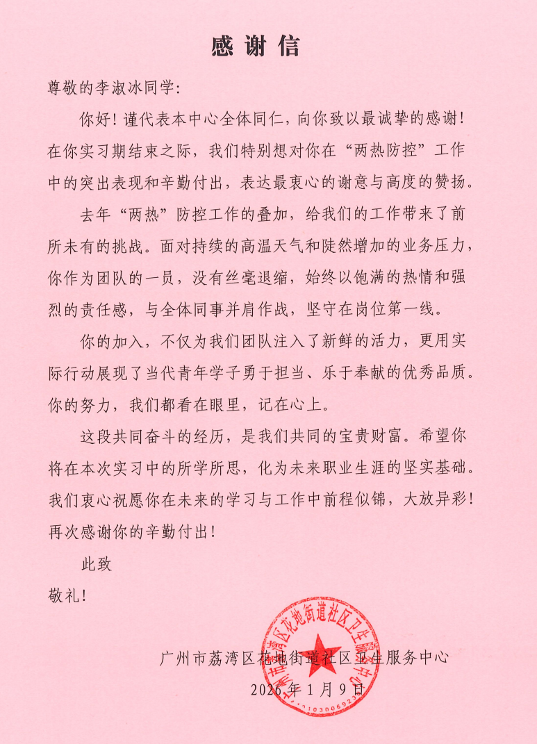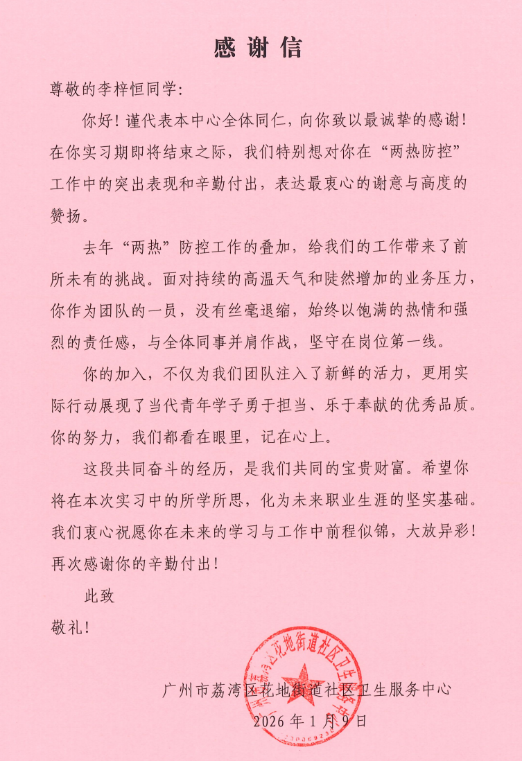 近日,廣州市荔灣區(qū)花地街道社區(qū)衛(wèi)生服務(wù)中心正式向我院發(fā)來三封感謝信,對(duì) 2023 級(jí)實(shí)習(xí)生李淑冰(23 中醫(yī) 17 班)、凌桂華(23 中醫(yī) 17 班)、李梓恒(23 藥學(xué) 6 班)在基層實(shí)習(xí)期間的優(yōu)異表現(xiàn)給予高度評(píng)價(jià)與特別表?yè)P(yáng),充分肯定了三位學(xué)子的職業(yè)素養(yǎng)與實(shí)踐能力。